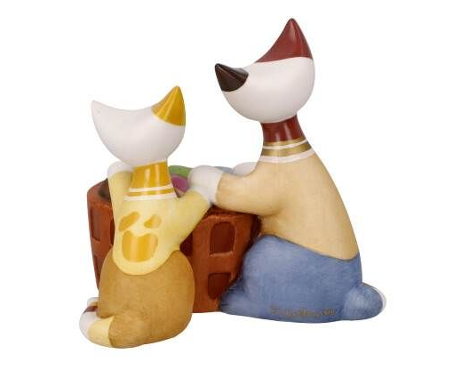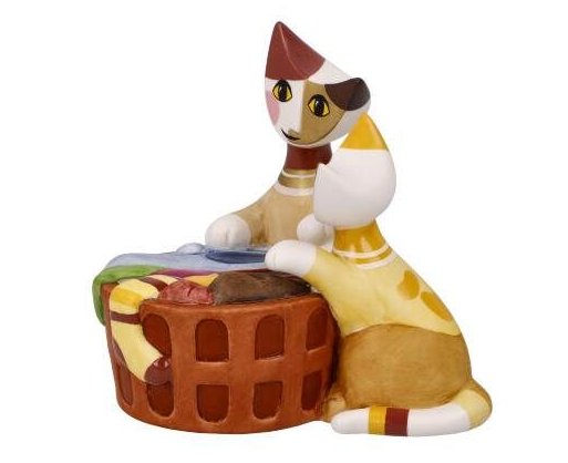 Mit ihren neugierigen Blicken und der fröhlichen Haltung zeigen die beiden kleinen Stubentiger, wie sie beim Wäschewaschen helfen – ein humorvolles Motiv, das den Alltag mit einem Augenzwinkern widerspiegelt. Diese liebevoll gestaltete Szene macht die Figur zu einem besonders herzlichen Hingucker.