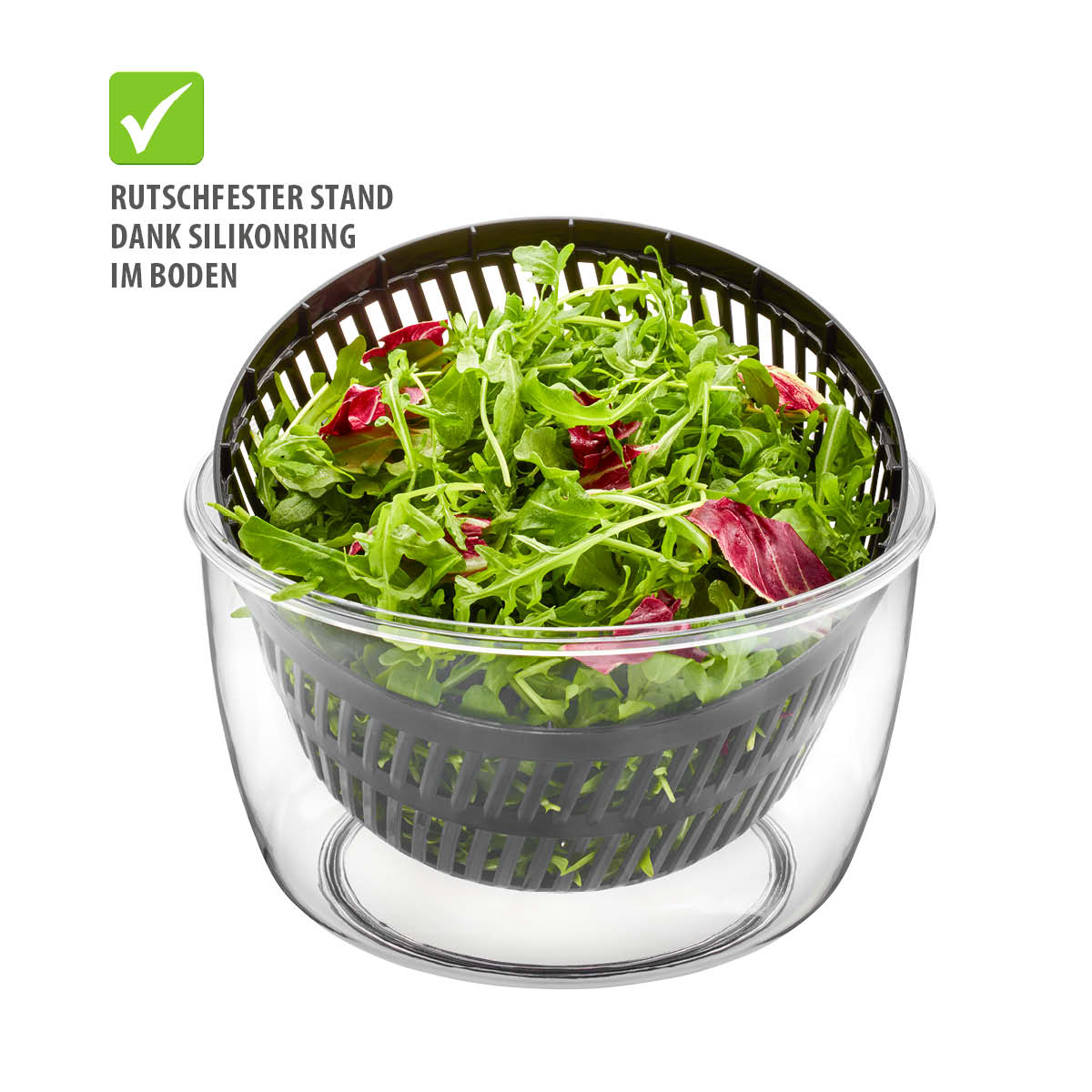Mit dem praktischen „Stopp“-Button lässt sich der Schleudervorgang jederzeit sicher beenden. Ein rutschfester Silikonring im Boden sorgt für stabilen Halt während der Nutzung. Die Schüssel und das Sieb sind spülmaschinengeeignet und bieten ein großzügiges Volumen von 5 Litern – ideal für kleine und große Portionen frischer Salate.