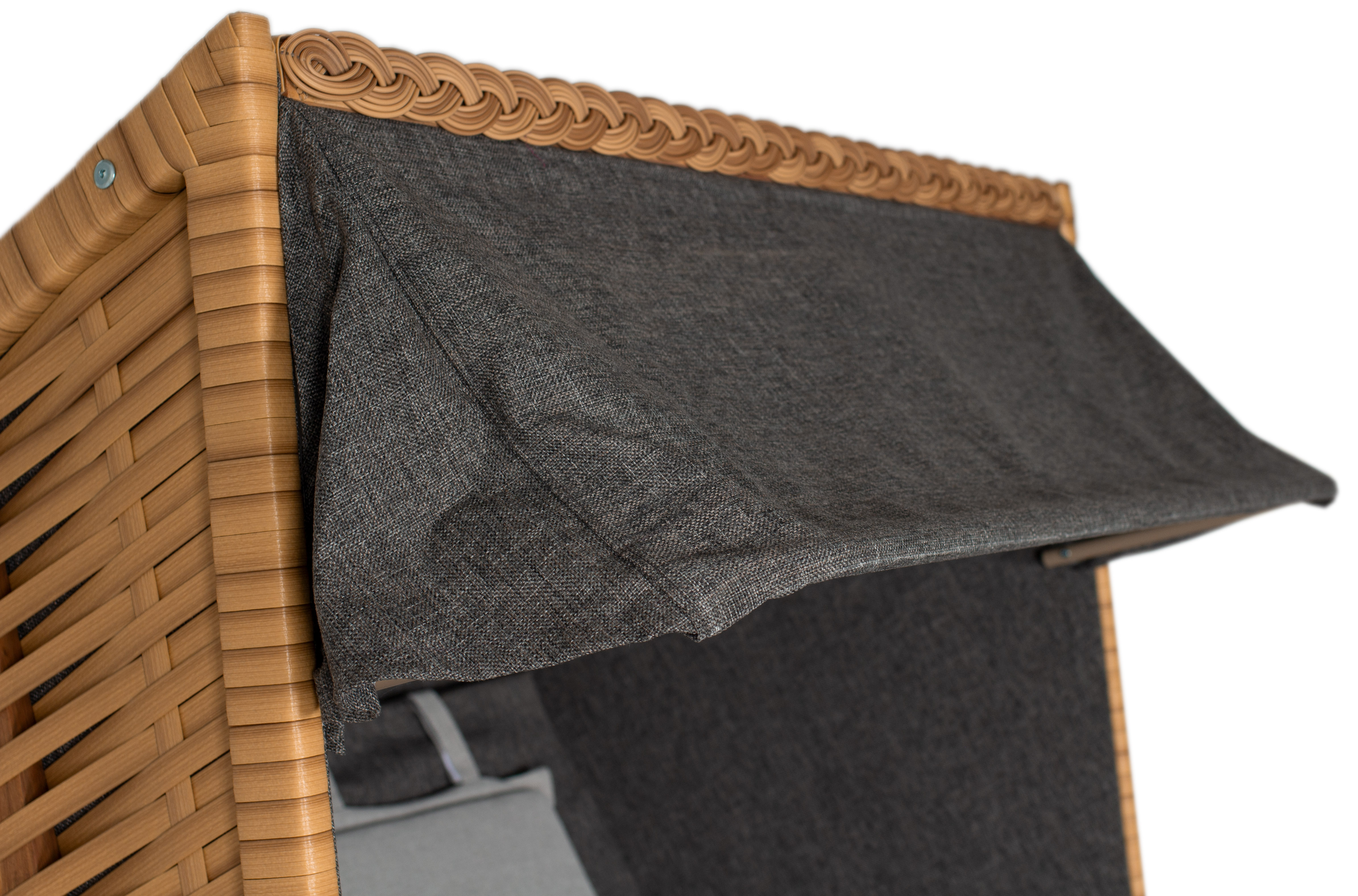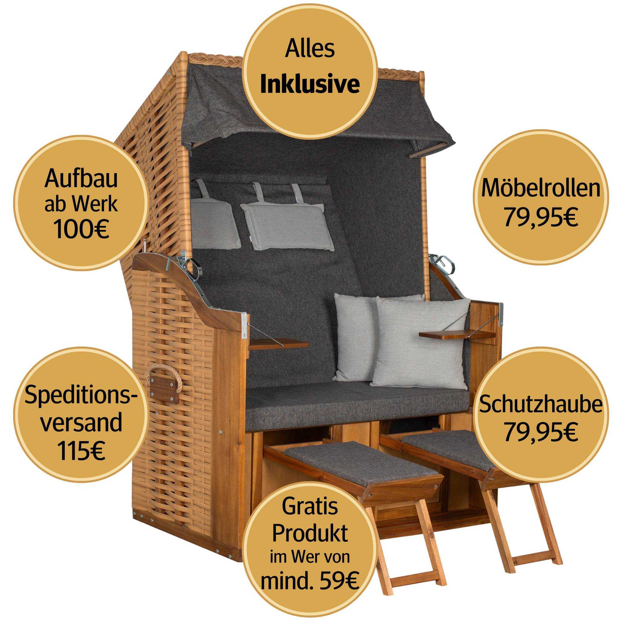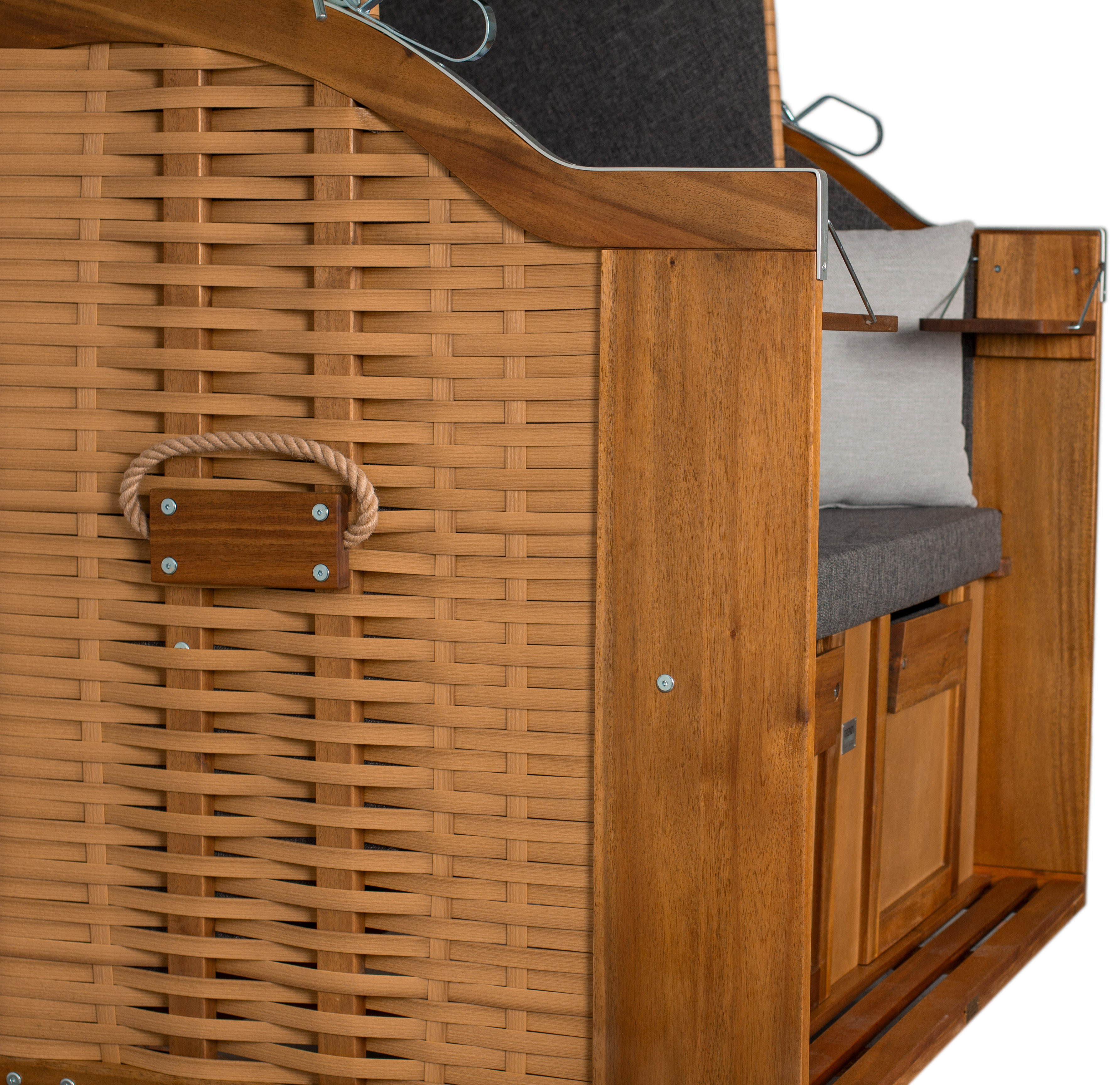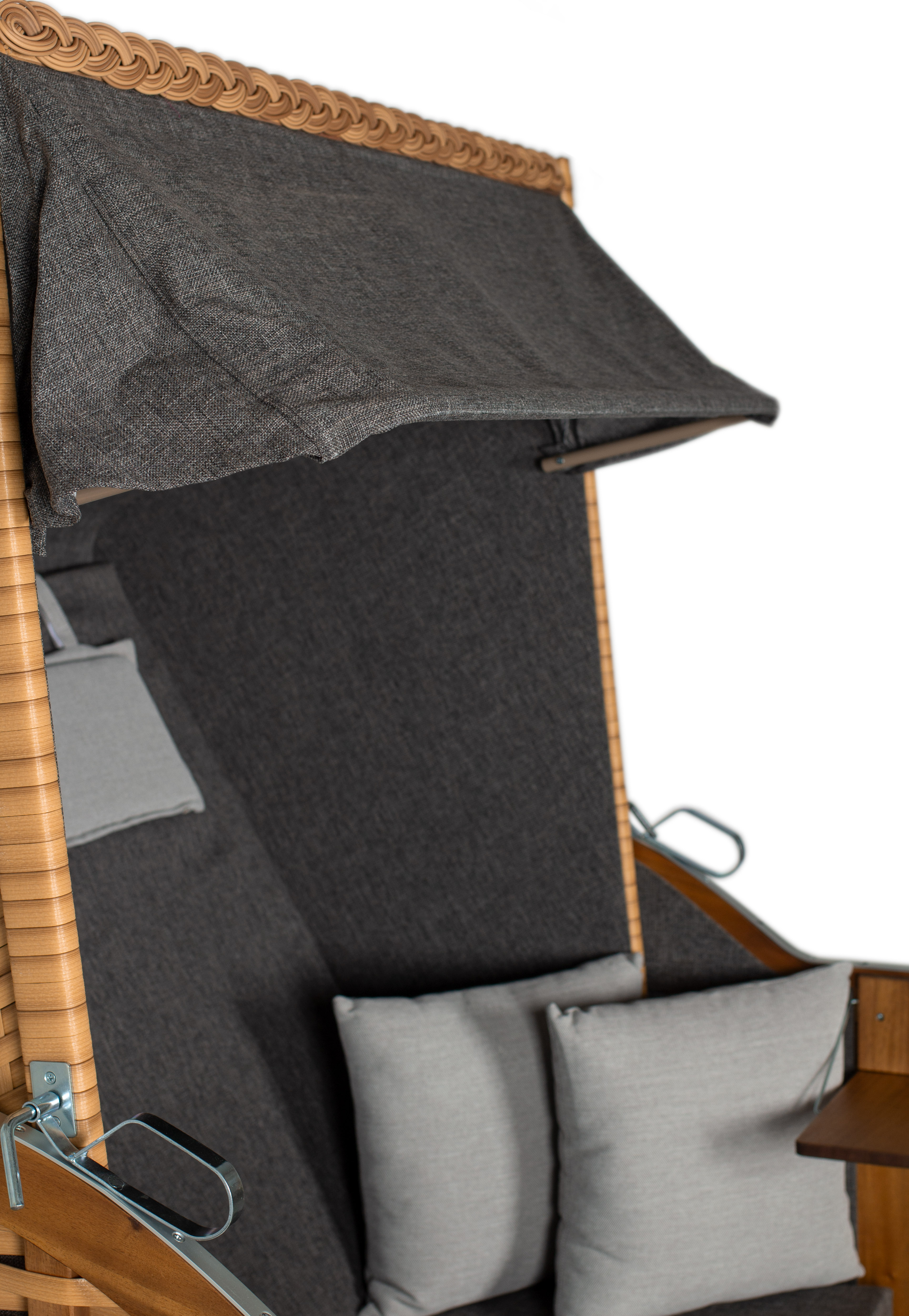Praktisch: Der Strandkorb wird fertig montiert geliefert und beinhaltet bereits Möbelrollen sowie eine passende Schutzhaube. Zwei integrierte Klapptische bieten zusätzlichen Komfort für Getränke oder Bücher.