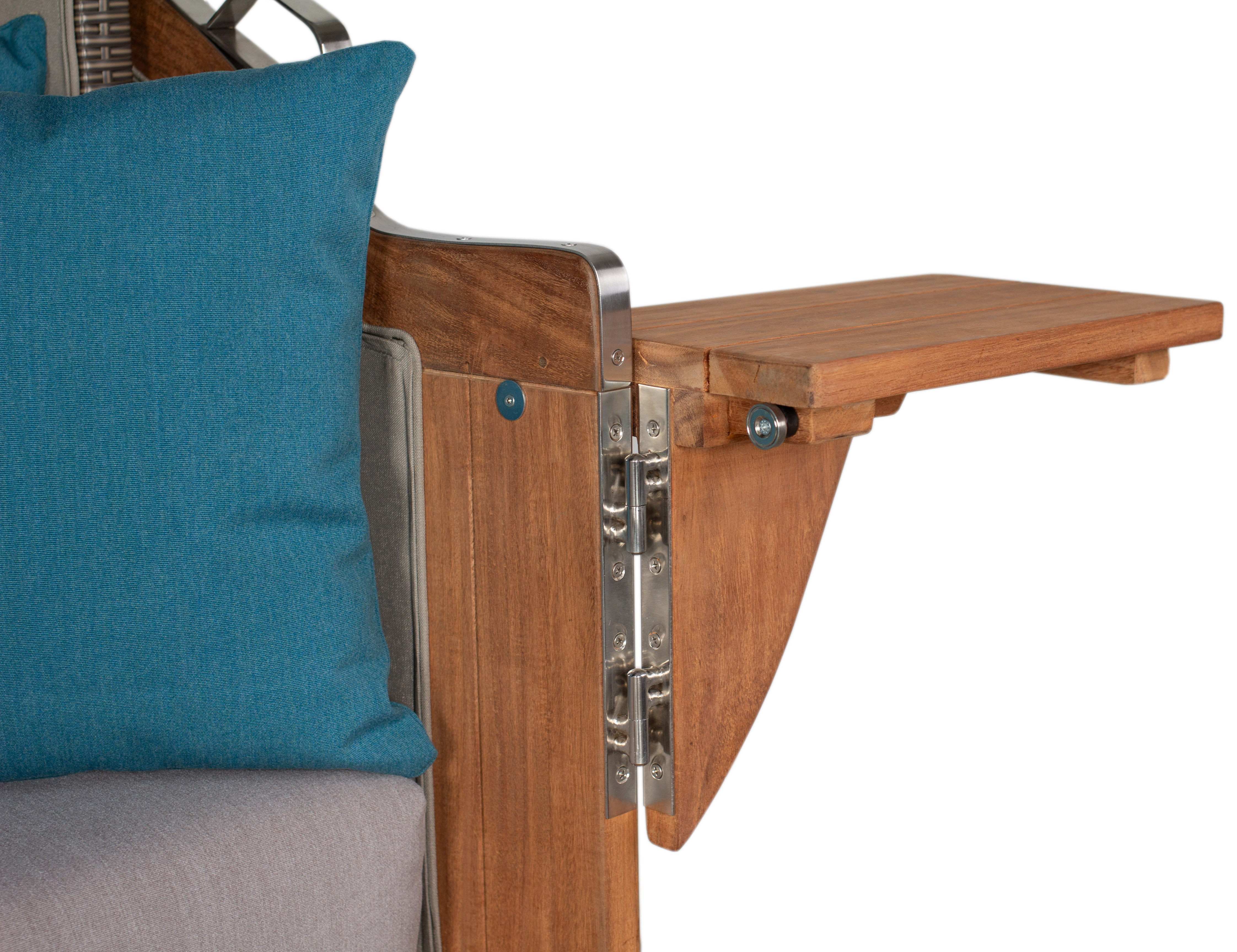 Die hohe Rückenlehne ist mehrfach bis 165° verstellbar, ausziehbare Fußstützen und zwei schwenkbare Cocktailtische sorgen für entspannte Stunden zu zweit.