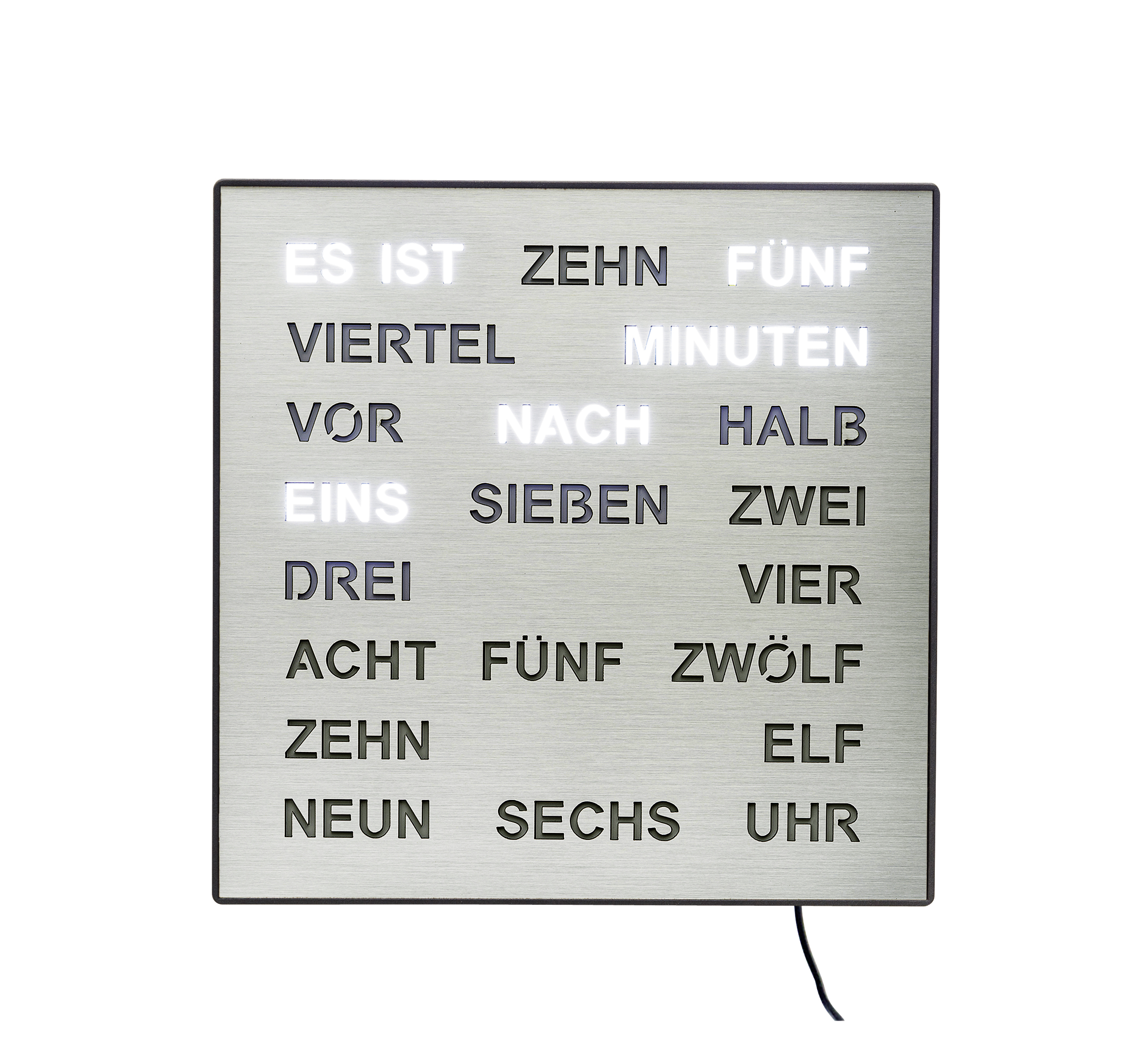 Diese moderne Wortuhr verbindet innovatives Design mit intelligenter Technik und wird zum echten Blickfang in jedem Raum. Ob als Tischuhr oder Wanduhr, sie zeigt die Uhrzeit auf außergewöhnliche Weise an: nicht mit Zeigern oder Zahlen, sondern mit leuchtenden Worten in deutscher Sprache.