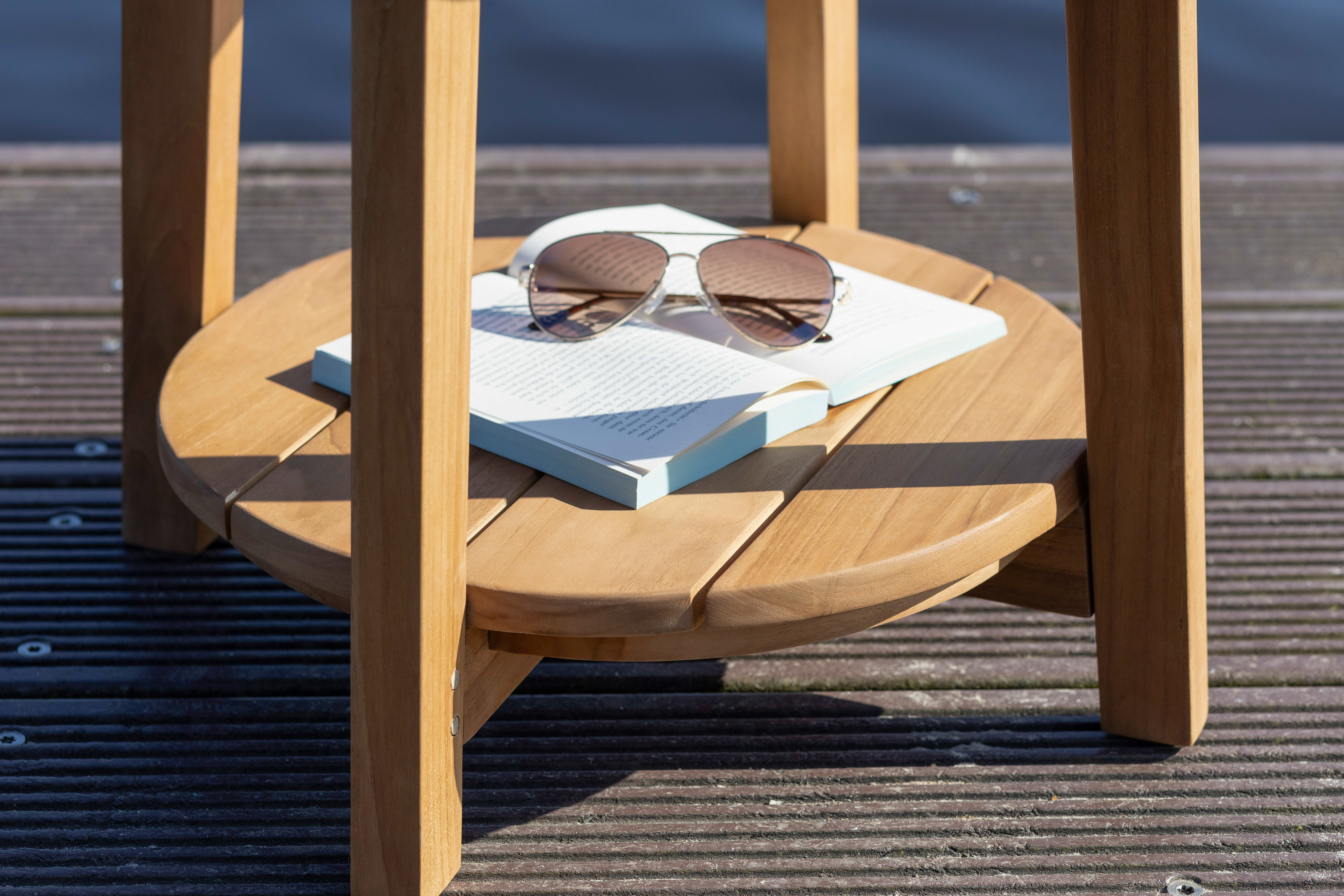 Die unbehandelte, glatte Teakholz-Oberfläche bringt die charaktervolle Maserung des Holzes zur Geltung und entwickelt mit der Zeit eine schöne Patina. Dank seiner wetterfesten Eigenschaften bleibt der Tisch auch bei Sonne, Regen und Kälte zuverlässig einsatzbereit. Die zusätzliche Ablagefläche bietet praktischen Stauraum – ob für Bücher, Getränke oder Dekoration.