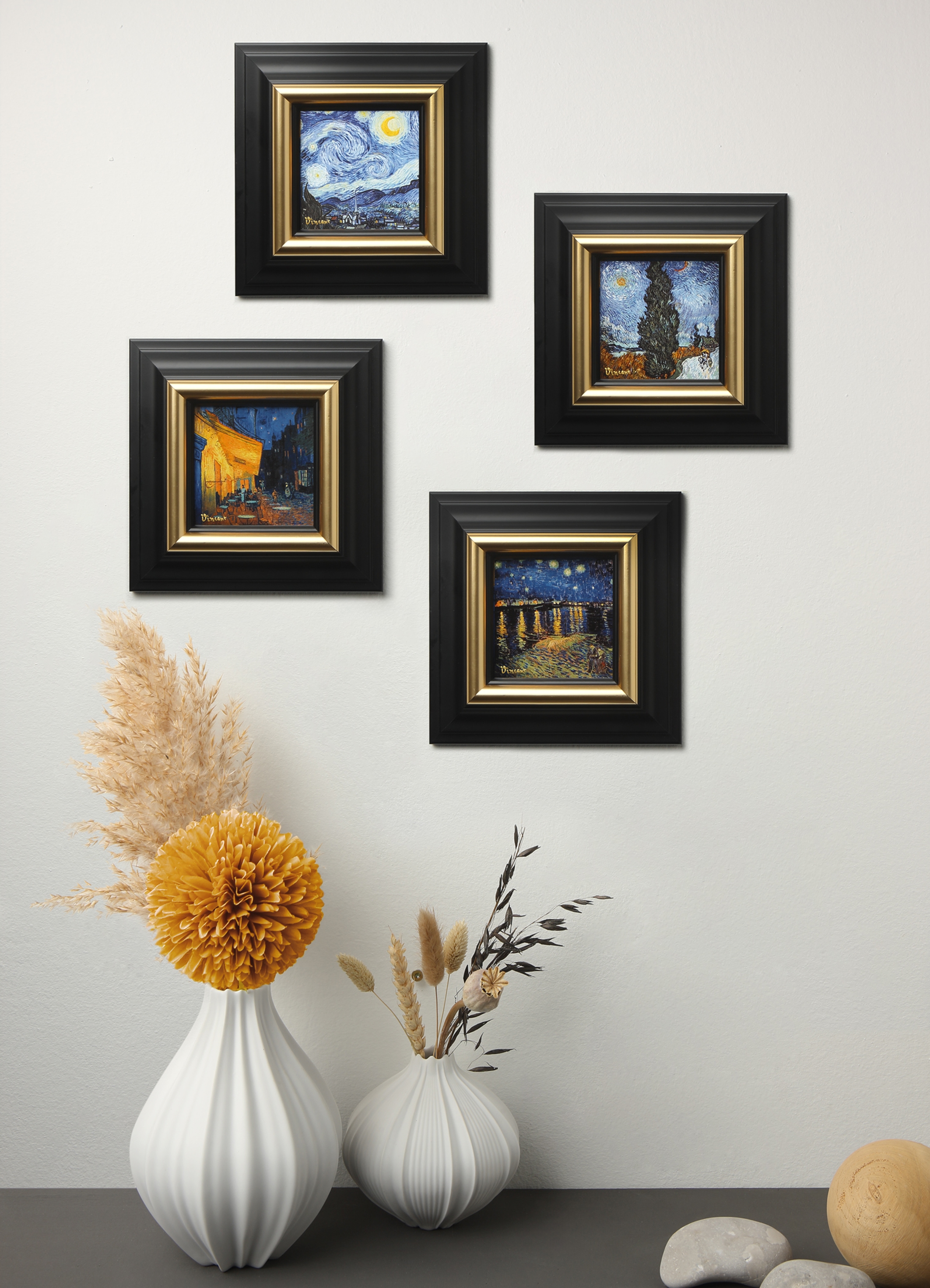 Das Gemälde Café bei Nacht von Vincent van Gogh zeigt eines der bekanntesten Werke von Vincent van Gogh und fängt die nächtliche Stimmung eines Straßencafés in Südfrankreich ein. Leuchtendes Gelb und tiefes Blau erzeugen ein ausdrucksstarkes Spiel von Licht und Schatten, das für van Goghs einzigartigen Stil steht. Der elegante schwarze Rahmen mit goldener Innenkante unterstreicht die leuchtenden Farben des Gemäldes und verleiht dem Kunstwerk eine hochwertige, klassische Anmutung. Dieses Wandbild bringt künstlerische Tiefe und historische Bedeutung in jedes Interieur und wird zum ausdrucksstarken Blickfang.