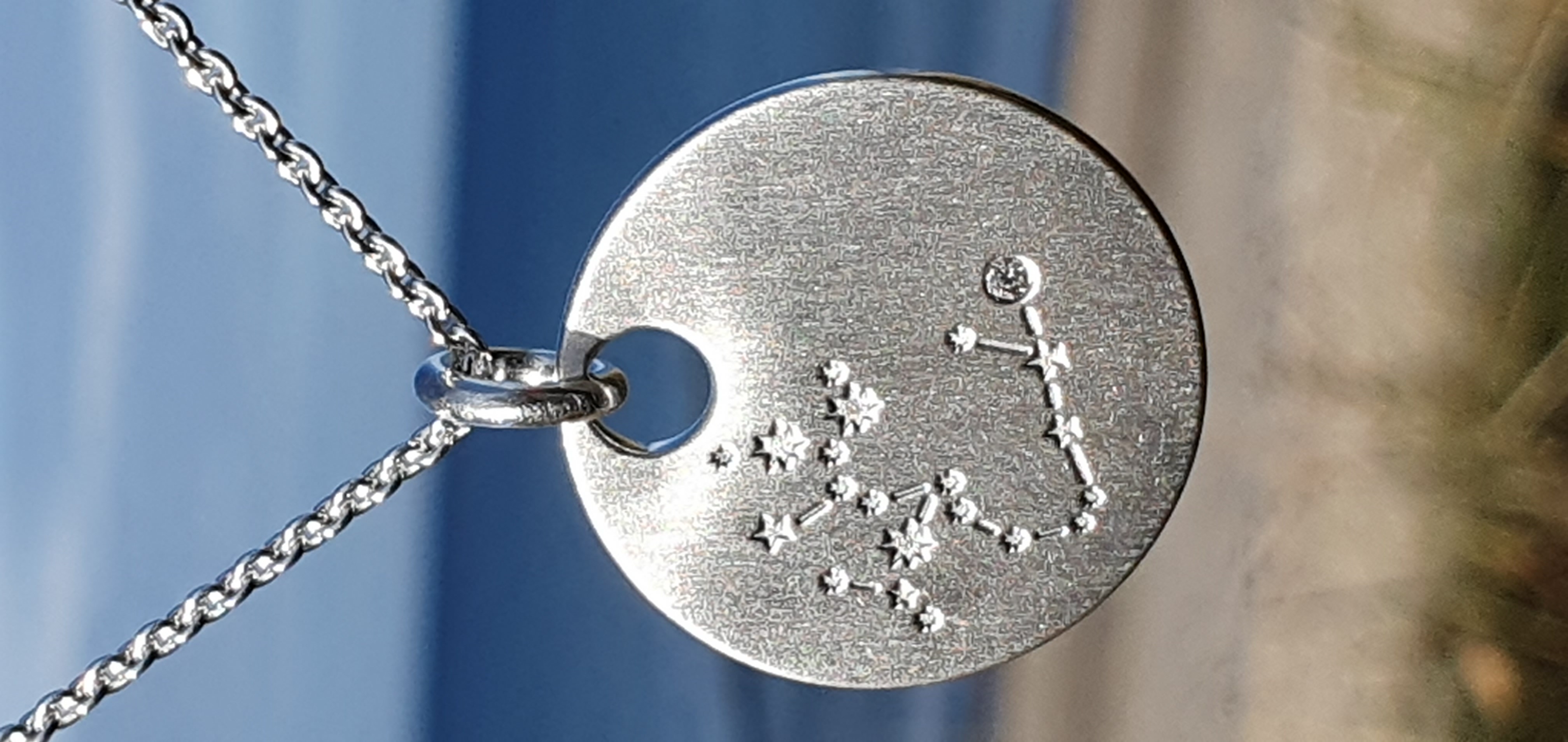 Entdecken Sie unsere exquisite "Kette mit Anhänger Sternbild" – ein zeitloses Schmuckstück, das Eleganz und Individualität vereint. Hergestellt aus hochwertigem Silber, strahlt dieser Anhänger nicht nur Schönheit aus, sondern erzählt auch Ihre persönliche Geschichte.