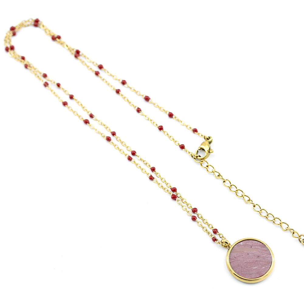 Die mit farbigen Perlchen verzierte Kette aus hochwertigem Edelstahl vereint schlichte Eleganz mit einem Hauch von Farbe. Der kleine Anhänger, wahlweise verziert mit einem Cabochon aus Perlmutt oder Jade, setzt farbige Akzente und macht jedes Outfit zu etwas Besonderem.