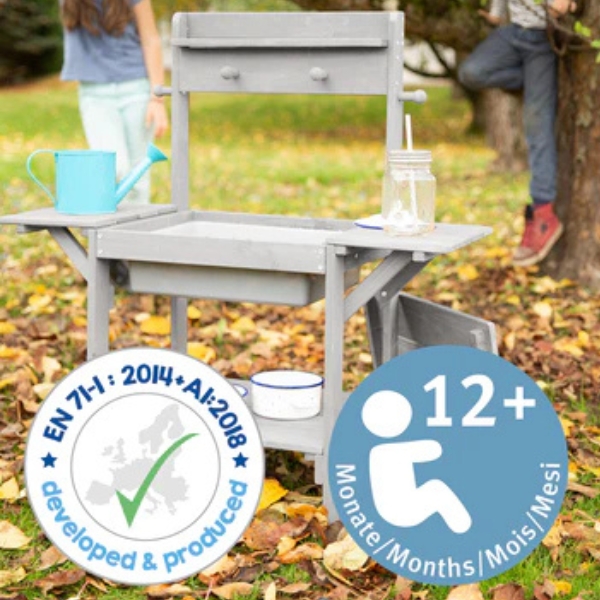 Die stabile und langlebige Konstruktion mit kindgerecht abgerundeten Ecken sorgt für optimale Sicherheit für die Kleinsten ab Monaten. Alle verwendeten Materialien sind schadstoffgeprüft und zertifiziert. Im Winter kann die Gartenküche auch als Basteltisch mit Stauwanne für Bastelsachen umfunktioniert werden.