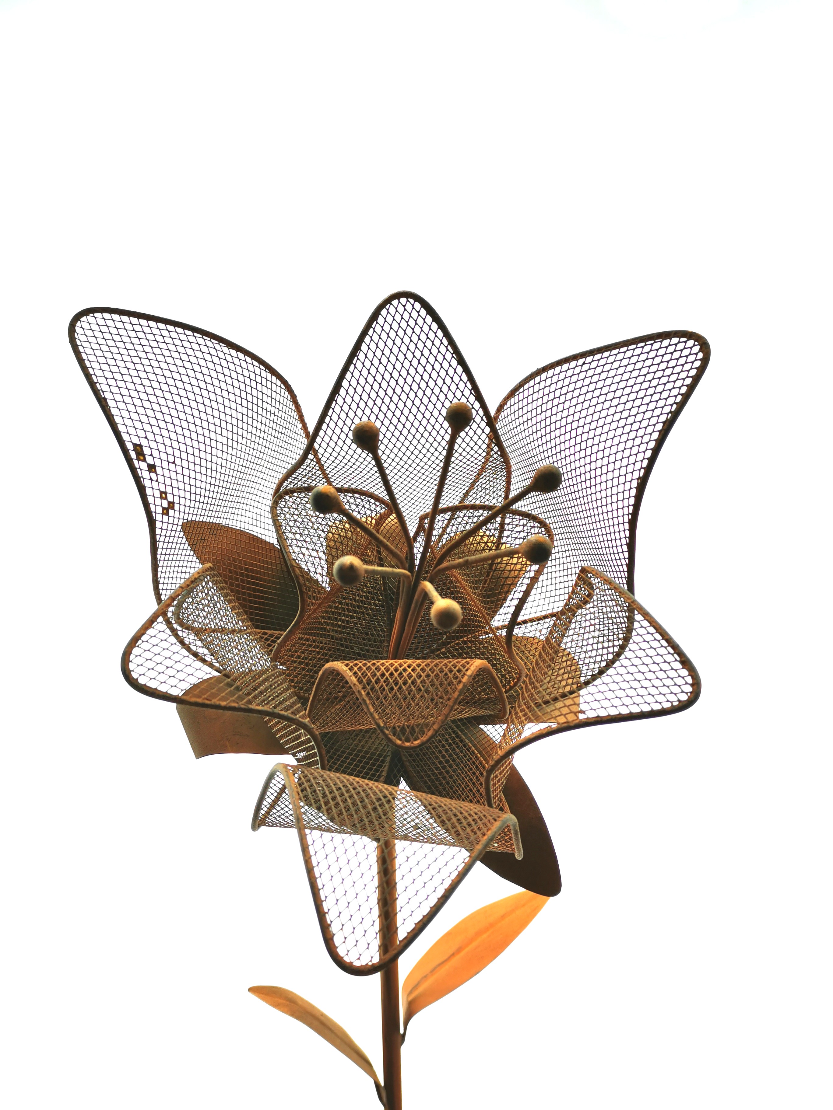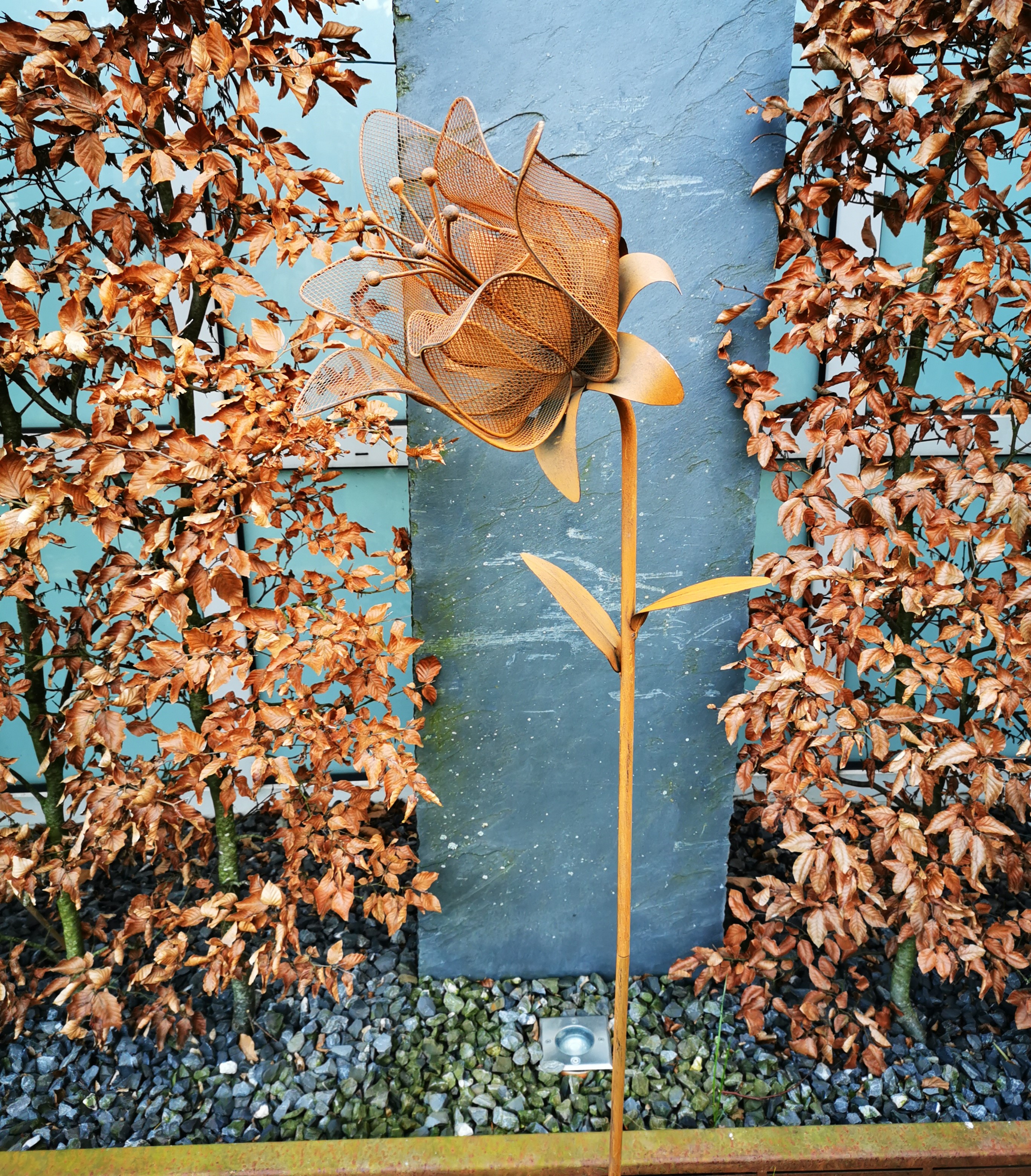 Diese kunstvoll gestaltete Metallblume Sila in Rostoptik ist ein einzigartiges Highlight für Garten, Terrasse oder Balkon. Der aufwendig gearbeitete Blumenkopf besteht aus filigranen Metallblättern, die für eine besonders edle und detailreiche Optik sorgen. Durch die natürliche Rostpatina erhält die Blume ihren charmanten Vintage-Look, der sich harmonisch in jede Outdoor-Gestaltung einfügt.