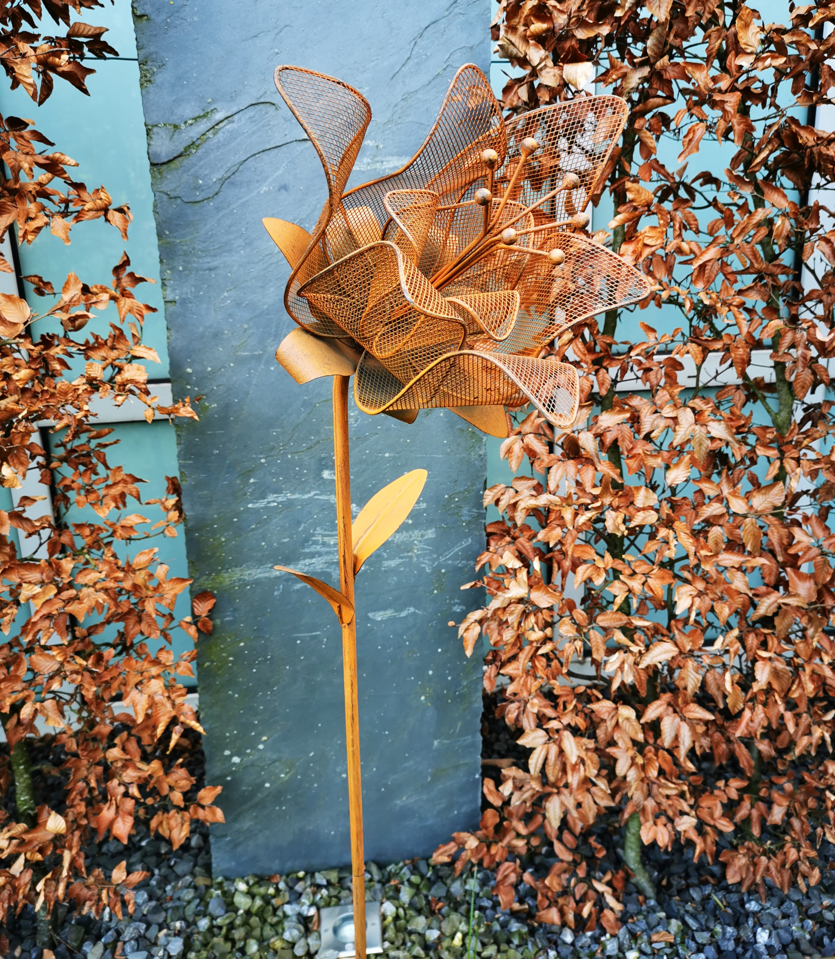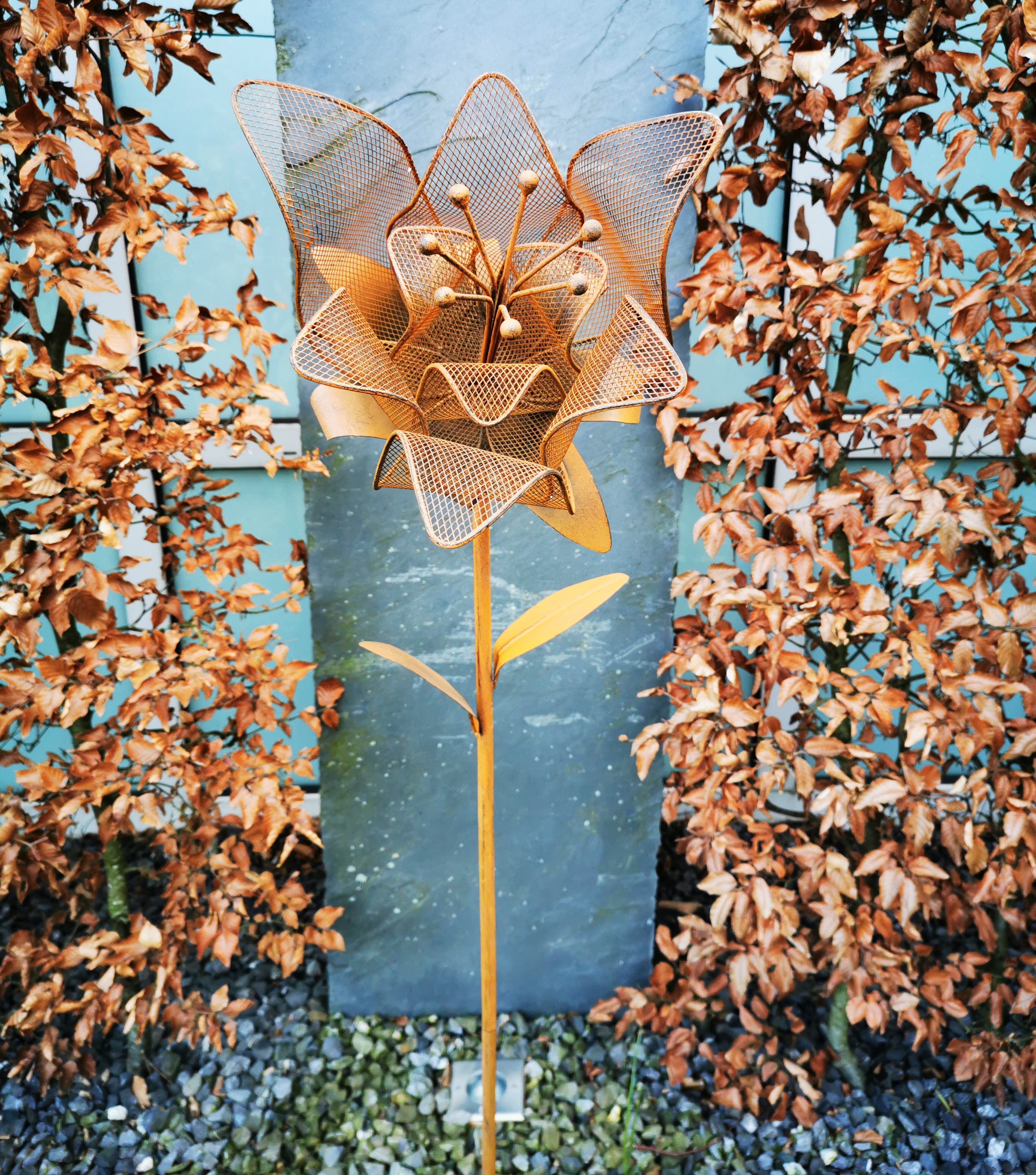 Dank des stabilen Steckstabs lässt sich die wetterfeste Dekoblume mühelos in Beete, Pflanzkübel oder Rasenflächen integrieren. Ob als einzelnes Deko-Element oder in Kombination mit weiteren Gartenfiguren – diese rostige Metallblume sorgt für einen stilvollen Blickfang in jedem Außenbereich.