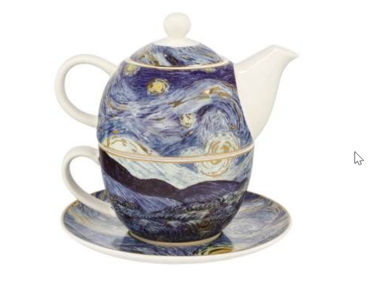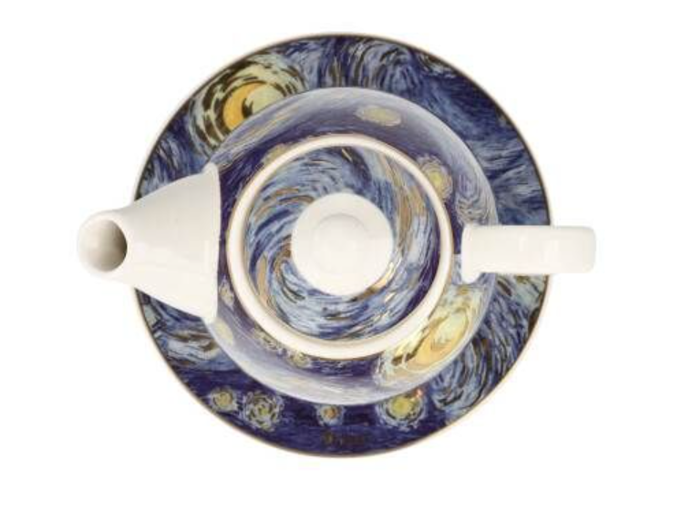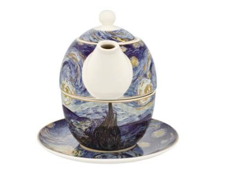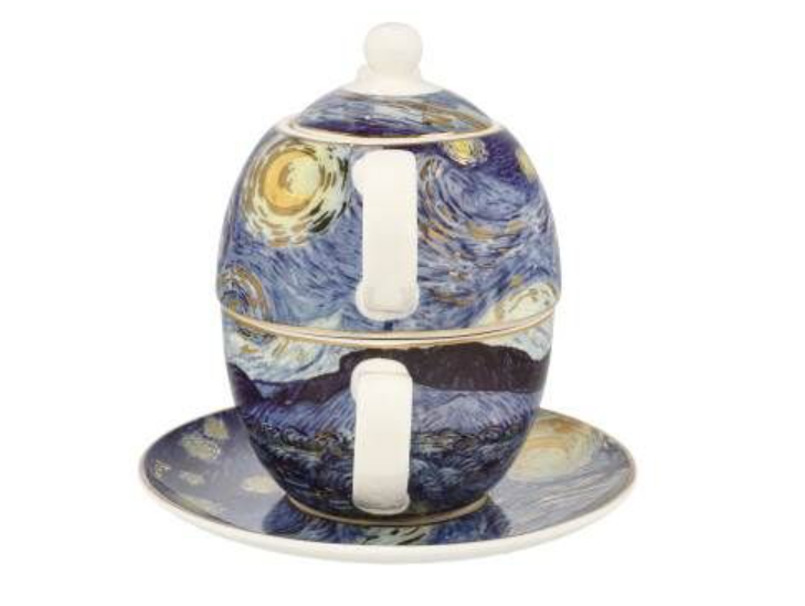 Edles Tea-for-One Set aus feinem Fine Bone China mit dem weltberühmten Motiv „Sternennacht“ von Vincent van Gogh. Die Kanne ist platzsparend mit der Tasse kombinierbar und wird durch die passende Untertasse ergänzt – ein multifunktionales Design für stilvollen Teegenuss.